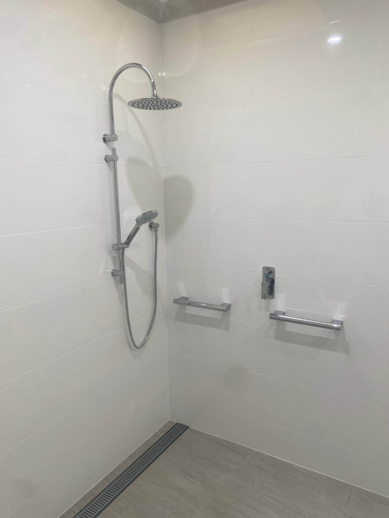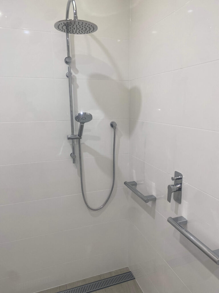 The shower upgrade included new fittings, handrails, and a flush linear drain. We installed newer, more water-efficient hardware in the toilet and laundry areas, and all the upgrades were topped off with flush, in-floor drainage in all wet areas to capture any spills or overflows.
